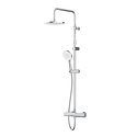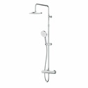 Устройство: душевая система • Смеситель: термостатический • Ручной душ (душевая лейка): размер 120 мм, настройки 3 шт • Верхний душ (тропический): размер 228 мм, настройки 1 шт • Комплектация: ручной душ, верхний душ, смеситель, стойка, шланг, крепление ручного душа