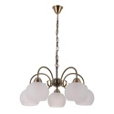 Подвесная люстра стиля модерн для гостиной, кабинета или спальни имеет размеры 600х950 мм. Арматура светильника окрашена в бронзовый цвет. Лампы в комплекте - отсутствуют. В светильнике применяются лампы накаливания или светодиодная LED-лампа. Цвет плафонов - белый с рисунком, с матовой поверхностью. Материал плафонов - стекло. Класс электробезопасности - I, степень пылевлагозащиты (IP) - 20. Максимальная мощность лампы (Вт) - 60. Светильник размещается на потолоке.