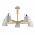 оригинальный светильник, который по достоинству оценят любители современных и уютных интерьеров. в осветительном устройстве удачно сочетаются конструктивные элементы из дерева и металла. каждый из 5 плафонов в виде усеченного конуса имеет боковое крепление к рожку оснащённое шарнирным узлом. данное решение позволяет изменять направление потока света для каждого источника отдельно. общий цвет люстры белый, который органично будет смотреться в любом помещении.