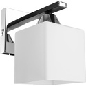 Бра стиля модерн для гостиной, кабинета или спальни имеет размеры 100х180х150 мм. Арматура светильника окрашена в хромовый и черный цвет. Лампы в комплекте - отсутствуют. В светильнике применяются лампы накаливания или светодиодная LED-лампа. Цвет плафонов - белый, с матовой поверхностью. Материал плафонов - стекло. Класс электробезопасности - I, степень пылевлагозащиты (IP) - 20. Максимальная мощность лампы (Вт) - 60. Светильник размещается на стене.