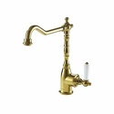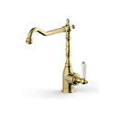 Назначение: кухонный • Конструкция: однорычажный • Монтаж: горизонтальный • Клапан: керамический • Материал: латунь, покрытие - бронза • Подводка: гибкая • Монтажные отверстия: 1 отверстие • Форма излива: традиционная • Душевая лейка в комплекте: нет
