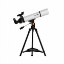 Асферические окуляры 23 мм (21,7 x) и 10 мм (50 x) с углом обзора в 60 градусов позволят рассмотреть каждую область звёздного неба. За четкостью изображения в ответе стеклянная линза с многослойным защитным покрытием. Телескопом может использовать даже ребёнок, поскольку штатив настраивается совершенно под любого пользователя.**характеристики**- Цвет Белый- Материал Металл- Размер самого телескопа, не учитывая триногу, 80 мм на 500 мм.- Толщина объектива - 80 мм.- Окуляры:- Асферический окуляр 62 градусов 1