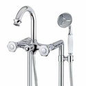 Назначение: ванна+душ • Конструкция: двухрычажный • Монтаж: горизонтальный • Материал: латунь, покрытие - хром • Подводка: жесткая • Монтажные отверстия: 2 отверстия • Форма излива: традиционная • Душевая лейка в комплекте: есть • Держатель для душевой лейки: на смесителе • Аэратор: есть • Эксцентрики в комплекте: есть