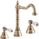 Назначение: для умывальника • Конструкция: двухрычажный • Монтаж: вертикальный • Клапан: керамический • Материал: латунь, покрытие - бронза • Подводка: жесткая • Монтажные отверстия: 3 отверстия • Форма излива: традиционная • Душевая лейка в комплекте: нет • Аэратор: есть • Донный клапан в комплекте: есть