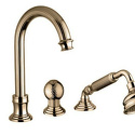 Назначение: ванна+душ • Конструкция: двухрычажный • Монтаж: горизонтальный • Клапан: керамический • Материал: латунь, покрытие - золото • Подводка: гибкая • Монтажные отверстия: 5 отверстий • Форма излива: традиционная • Душевая лейка в комплекте: есть • Аэратор: есть