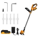 Двигатель: электрический (аккумулятор), 350 Вт • Аккумулятор: 21 В, 2 Ач, 2 шт • Покос: ширина 15 см • Вес косилки: 2 кг