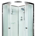 Монтаж душевой кабины осуществляется без использования силикона. Латунный смеситель с керамическими картриджами и резьбовыми соединениями. 100% акриловый поддон с дренажными отводами, высотой 15 см усиленный металлическим каркасом с вставкой из антибактериального полимера. Матовое безопасное закаленное сверхпрочное стекло толщиной 4 мм с антикальциевой обработкой. Душевая штанга с регулировкой лейки по высоте и ручная лейка с силиконовыми форсунками. диаметром 140 мм с функцией переключения режимов.