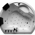 Материал: акрил • Расположение: отдельно стоящая • Форма: нестандартная • Количество мест: двухместная • Гидромассаж: есть, 11 форсунок • Аэромассаж: есть • Озонирование: есть • Подсветка: есть • Комфорт: подголовник • Смеситель в комплекте: есть • Размеры (ДxШxВ): 185x183x74 см