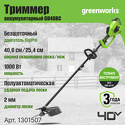 Производитель: Greenworks Модель: 1301507 G-MAX 40V GD40BC - Тип переносной триммер - Ширина скашивания 35 см - Скорость вращения ножа до 6500 об./мин Описание