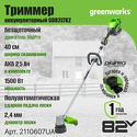 | 119021, Россия, г. Москва, ул. Тимура Фрунзе, д. 11, строение 44, этаж 5 Триммер аккумуляторный GD82LTK2 82V GREENWORKS 40 см АКБ 2.5 Ач и ЗУ Доставка — от 49 руб. Из Москвы. | 58 165 руб. | В магазин | |