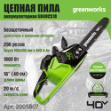 | 119021, Россия, г. Москва, ул. Тимура Фрунзе, д. 11, строение 44, этаж 5 Цепная пила аккумуляторная Greenworks 2008807, 40V, 40 см, 2000 Вт, бесщеточная, без АКБ И ЗУ Доставка — от 49 руб. Из Москвы. | 19 990 руб. 26 653 руб. -25% | В магазин | |