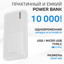 Внешний аккумулятор • 10000 мАч • сила тока до 2 A • индикатор уровня заряда • 72x123x21 мм • вес 215 г