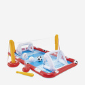 Просторный надувной центр с ярким и заметным бортиком, удерживающим на площадке тонкий слой хорошо прогретой водички, подойдет для групповых и индивидуальных развлечений детворы любого возраста.Игры с мячом, плескания и детский смех гарантированно создают радостное настроение в солнечный день. Этому во многом способствует и расцветка площадки - надувной центр Intex напоминает футбольное поле, но с совершенно фантастическим сочетанием оттенков безоблачного неба и прибрежной морской линии.Стойки золотистого