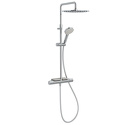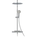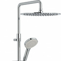 Устройство: душевая система • Смеситель: термостатический • Ручной душ (душевая лейка): размер 110 мм, настройки 3 шт • Верхний душ (тропический): размер 300 мм, настройки 1 шт • Комплектация: ручной душ, верхний душ, смеситель, стойка, шланг, крепление ручного душа, полка