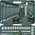 Комплектация1/2’’ DR:- Торцевые головки, 20 шт.: 8, 9, 10, 11, 12, 13, 14, 15, 16, 17, 18, 19, 20, 21, 22, 23, 24, 27, 30, 32 мм;- Торцевые головки Е-профиль внешний Torx, 5 шт.: Е-11, Е-12, Е-14, Е-16, Е-18;- Торцевые головки свечные, 2 шт.: 16 и 21 мм;- Удлинители, 2 шт.: 1250 и 250 мм;- Удлинитель с шаром 50 мм;- Трещоточная рукоятка;- Вороток Т-образный 250 мм;- Шарнир карданный.1/4’’ DR:- Торцевые головки, 9 шт.: 4, 4.5, 5, 5.5, 6, 7, 8, 9, 10 мм;- Торцевые головки Е-профиль внешний Torx, 6 шт.: Е-4, Е-5, Е-6, Е-7, Е-8, E-10;- Шарнир карданный;- Вороток Т-образный 130 мм;- Трещоточная рукоятка, 36 зубцов;- Адаптер для вставок (бит);- Отверточная рукоятка 150 мм;- Вставки (биты), 20 шт.:- Шестигранные Нех, 8 шт.: 3, 4, 5, 6, 7, 8, 10, 12 мм;- Torx, 8 шт.: Т15, Т20, Т25, Т27, Т30, Т40, Т45, Т50;- Spline, 4 шт.: М6, М8, М10, М12.- Гибкий удлинитель 145 мм;- Ключи комбинированные, 14 шт.: 8, 10, 11, 12, 13, 14, 15, 16, 17, 18, 19, 21, 22, 24 мм;- Ключи разрезные, 4 шт.: 8х10, 11х13, 12х14, 17х19 мм;- Ключ разводной 8’’ (200 мм);- Отвертки, 4 шт.: (+) PH 1x80 мм, (+) PH 2х100 мм, (-) SL 1х5,5х125, (-) SL 1,2х6,5х150;- Ручка магнитная;- Пассатижи 7” (175 мм).