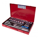 КомплектацияГоловки короткие 12-гранные: 8, 9, 10, 11, 12, 13, 14, 15, 16, 17, 18, 19, 20, 21, 22, 23, 24, 25, 26, 27, 28, 29, 30, 32 ммГоловка свечная 12-гранная: 14 ммГоловка свечная 12-гранная: 16 ммТрещотка флажковая: 32 зубца, 250 ммВороток с шарниром: 450 ммВороток скользящий T-типа: 300 ммКардан: 77,5 ммУдлинители: 75, 125, 250 мм