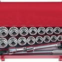 Комплектация- Удлинитель 3/4", 100 мм;- Удлинитель 3/4", 200 мм;- Вороток с шарниром 3/4", 450 мм;- Скользящий вороток 3/4", 500 мм;- Головки размером 22, 24, 27, 30, 32, 36, 38, 41, 46 и 50 мм, 7/8, 15/16, 1, 1 1/8, 1 3/16, 1 5/16, 1 3/8, 1 7/16, 1 5/8, 1 3/4, 1 7/8 и 2 дюйма;- Металлический кейс.