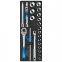 Комплектация- Головки короткие 6-гранные 6, 7, 8, 9, 10, 11, 12, 13, 14, 15, 16, 17, 18, 19, 21, 22, 24 мм- Трещотка флажковая 32 зубца, 200 мм- Вороток скользящий Т-типа 200 мм- Вороток с шарниром 200 мм- Удлинители с шаровым окончанием 15° двухпозиционные 75, 150 мм- Кардан 56,5 мм- Упаковка