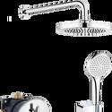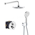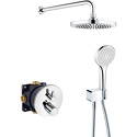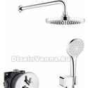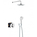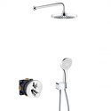 Устройство: душевая система • Смеситель: термостатический • Ручной душ (душевая лейка): размер 120 мм, настройки 1 шт • Верхний душ (тропический): размер 250 мм, настройки 1 шт • Комплектация: ручной душ, верхний душ, смеситель, шланг, крепление ручного душа