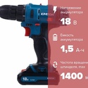 Производитель: Kraton Модель: CDB-18-Li-1.5 - Тип: дрель-шуруповерт, пистолетная - Обороты: 1400 об/мин, скоростей 2 - Патрон: быстрозажимной, Ø 10 мм Описание