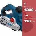 Ширина строгания 110 мм, глубина строгания 3.5 мм, мощность 1300 Вт, скорость вращения 16000 об/мин, выборка четверти до 3.5 мм, v-образные желобы для снятия фасок: нет, возможно стационарное крепление