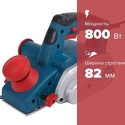 Ширина строгания 82 мм, глубина строгания 3 мм, мощность 800 Вт, скорость вращения 16000 об/мин, выборка четверти до 3 мм, v-образные желобы для снятия фасок: 1