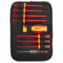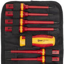 Комплектация- Диэлектрическая бита: шлиц 3.0х100- Диэлектрическая бита: шлиц 4.0х100- Диэлектрическая бита: шлиц 5.5х100- Диэлектрическая бита: PH1х80- Диэлектрическая бита: PH х100- Диэлектрическая бита: PZ1х80- Диэлектрическая бита: PZ2х100- Тестер напряжения 110–250 В- Диэлектрическая рукоятка для сменных бит