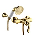 Назначение: душ • Конструкция: однорычажный • Монтаж: вертикальный • Клапан: керамический • Материал: покрытие - золото • Подводка: жесткая • Монтажные отверстия: 2 отверстия • Душевая лейка в комплекте: есть • Держатель для душевой лейки: настенный держатель • Эксцентрики в комплекте: есть • Донный клапан в комплекте: есть
