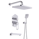 Устройство: душевая система • Смеситель: джойстик • Ручной душ (душевая лейка): размер 110 мм, настройки 3 шт • Верхний душ (тропический): размер 300 мм, настройки 1 шт • Комплектация: ручной душ, верхний душ, смеситель, шланг, крепление ручного душа