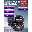 Производитель: Lifan Модель: 170F-H - Тип топлива: бензин - Объем: 212 см³ - Мощность: 5.1 кВт, 7 л.с. - Запуск: ручной - Вал: шпонка, диаметр 19 мм Описание