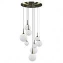Подвесной светильник стиля модерн для гостиная имеет размеры 700x1820 мм. Арматура светильника окрашена в бронзовый цвет. Лампы в комплекте - отсутствуют. В светильнике применяются лампы накаливания или светодиодная LED-лампа. Цвет плафонов - белый, с матовой поверхностью. Материал плафонов - стекло. Класс электробезопасности - I, степень пылевлагозащиты (IP) - 20. Максимальная мощность лампы (Вт) - 40. Светильник размещается на потолоке.