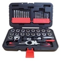 КомплектацияМетчики и плашки - 34 шт: M3×0.5, M3×0.6, M4×0.7, M4×0.75, M5×0.8, M5×0.9, M6×1.0, M7×1.0, M8×1.25, M9×1.0, M9×1.25, M10×1.25, M10×1.5, M11×1.5, M12×1.5, M12×1.75, 1/8BSP28; Ключ трещоточный – 1 шт; Метчикодержатель M3-M6 – 1 шт; Метчикодержатель M6-M12 – 1 шт; Плашкодержатель – 1 шт; Резьбомер – 1 шт; Отвертка - 1 шт