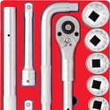 КомплектацияСтандартные торцевые двенадцатигранные головки 3/4" размером 30, 32, 33, 36, 38, 41, 46, 50 мм;Трещотка с флажком, 45 зубцов и кнопка быстрого сброса 3/4" 260 мм;Вороток L-образный 3/4" 350 мм;Рычаг-удлинитель для трещотки и воротка 350 мм;Удлинители прямые 3/4" размером 100, 200 мм;Ложемент.