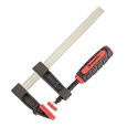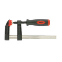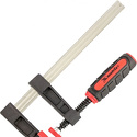 F-образная струбцина используется для зажима металлических, деревянных и других заготовок для их последующей обработки или сборки. Представляет собой штангу, на которой установлены 2 кронштейна — неподвижный и подвижный. Деталь помещается между ними и прижимается к губкам при помощи винтового зажима с трапециевидной резьбой. Струбцину применяют при выполнении слесарных и столярных работ.