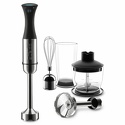 Тип: погружной (ручной) блендер • Мощность: 1250 Вт • Скорости: плавная регулировка, импульсный • Насадки: ножка, венчики, нож для измельчителя • Дополнительно: для пюре