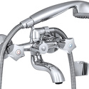 Материал изделия: Латунь марки ЛС59-1. Покрытие изделия : никель-хромовое; Материал ручек: цинк; Шланг душевой: Резиновый шланг в оплетке из нержавеющей стали. Покрытие шланга: 2-х слойный никель; Цвет изделия: хром; Излив: литой. Лейка душевая: -функциональная, пластик.