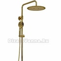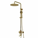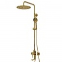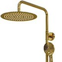 Устройство: душевая система • Смеситель: джойстик • Ручной душ (душевая лейка): настройки 3 шт • Верхний душ (тропический): размер 250 мм, настройки 1 шт • Комплектация: ручной душ, верхний душ, смеситель, стойка, шланг, крепление ручного душа • Покрытие: под золото