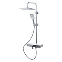 Устройство: душевая система • Смеситель: термостатический • Ручной душ (душевая лейка): размер 86 мм, настройки 3 шт • Верхний душ (тропический): размер 280 мм, настройки 1 шт • Комплектация: ручной душ, верхний душ, смеситель, стойка, шланг, крепление ручного душа, полка