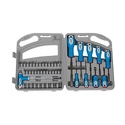 Комплектация- битодержатель,- биты 27 шт: HEX 1.5, HEX 2, HEX 2.5, HEX 3, HEX 4, HEX 5, HEX 5.5, HEX 6, PH 000, PH 1, PH 2, PH 3, PZ 0, PZ 1, PZ 2, PZ 3, SL 3.0, SL 4.0, SL 5.0, SL 6.0, SL 7.0, T10, T15, T20, T25, T30- отвертка универсальная,- отвертки 9 шт: PH0x75 мм, PH1x75 мм, PH2x100 мм, PH2x38 мм, SL3.0х75 мм, SL5.0x75 мм, SL6.0x38 мм, SL8.0x150 мм- переходник HEX 1/4"-SQ 1/4",- торцовые головки 9 шт: 10 мм, 11 мм, 12 мм, 13 мм, 5 мм, 6 мм, 7 мм, 8 мм, 9 мм